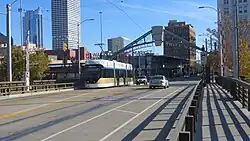 The Hop, also known as the Milwaukee Streetcar, is a modern streetcar system in Milwaukee, Wisconsin. The system's 2.1-mile (3.4 km)[5][3][6] original "M" line connects the Milwaukee Intermodal Station and Downtown to the Lower East Side and Historic Third Ward neighborhoods.[7] On April 11, 2024, a 0.4-mile (640 m) Lakefront, or "L" line,[5] to the nearly complete high-rise development The Couture, began offering full daily service. Additional extensions for new lines are currently in the planning stage. The system is owned by the city and operated by Transdev.