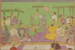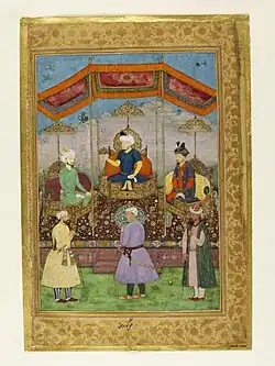 The two middle registers depict the principal subject. The painting portrays eight of the nine rulers of the Bijapur Sultanate, leaving out only Mallu Adil Khan, whose reign lasted for only seven months.[10] Each king is seated on a throne, the throne of the dynastic patriarch being the most elaborate.[1] The thrones are placed upon a blue and gold floral carpet, from which rise flat ceremonial umbrellas. The style of the carpet and the umbrellas is also local to the Deccan.[11]
