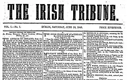 Other Young Irelanders conspired to fill the gap left by Mitchel. For The Irish Tribune, the proprietors were scientist and physician, Thomas Antisell, who had a clinic, a lectureship in botany and was an assistant to the chemist Professor Robert Kane, and two medical students, Kevin O'Doherty and Richard Williams. It was published at 11 Trinity Street, Dublin, and printed by Denis Hoban. The first issue came out on 10 June 1848. Antisell helped with the funding (there were shareholders) and contributed articles. Williams' poetry had been published in The Nation and another contributor published in The Nation, John Savage, penned poems for the Tribune. The paper included a full-page memoir of John Mitchel, a republican manifesto, articles reporting on chartism the revolutionary fervour across Europe, and an advertisement for John Martin's imminent "successor" to The United Irishman, The Irish Felon.[4] The Tribune itself was considered by many to be that successor, but in the second issue editors clarified this was not intended (orders for the Tribune had been sent to The United Irishman's office at 12 Trinity Street).[5][6][7][8]