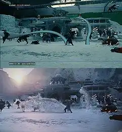 The film also used matte paintings, which had to be in 3D because the visual style included long-duration shots in which the camera always moved.[47] The climax, which was enacted on a 200 by 200 feet (61 m × 61 m) set, had to be merged with stills of the Greenland landscapes, as well as the low-angle lighting that was captured on location there.[47] The camera was animated to get angles needed for different shots in the film by importing these stills into the computer. Multiple cameras were utilized to achieve the different wire-work and animation that was used to create the creatures and many fight scenes within the film. In creating these creatures, the team looked at various real-world creatures to influence the look of the lemur Momo's wings.[47] In order for them to be believable, they looked for examples of the same size and weight as the animated character and then produced hybrids from different animals to make each species distinct. This was done by observing actual animals to get a take on how they would act.[47] Shyamalan's take on the personality of each creature also influenced the creation stage of the creatures. For example, Momo has flying mechanics based on a giant fruit bat. Other elements, such as texturing, hair or scale simulation, and light and shadow complementary to the live action, were added to make the final animation appear as real as possible during the later stages of character development.[47]
