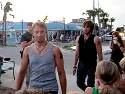 From left to right, cast members Adam Barnett, Nick Lashaway, and Carly Chaikin make their way to the filming of the bonfire scene under the Tybee Island pavilion on July 30, 2009