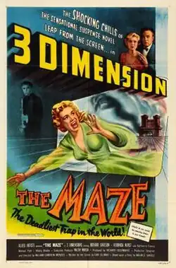 The Maze is a 1953 3-D horror film starring Richard Carlson, Veronica Hurst and Hillary Brooke. It was directed by William Cameron Menzies and distributed by Allied Artists Pictures.[1] It was to be the second 3-D film designed and directed by William Cameron Menzies, known for his very "dimensional" style (e.g. many shots focused in layers). It was his final film as production designer and director.
