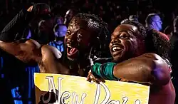 At Extreme Rules on April 26, The New Day defeated Kidd and Cesaro to capture the WWE Tag Team Championship; Big E and Kingston were the participants in the match, but WWE also recognized Woods as champion under the Freebird Rule, in which any two members of a stable can compete for the titles.[41] At Payback on May 17, Big E and Kingston defeated Kidd and Cesaro in a two-out-of-three falls match to retain the WWE Tag Team Championship after Woods pinned Cesaro, despite not being a legal participant in the match.[42] At Elimination Chamber on May 31, all three New Day members competed in the first-ever tag team Elimination Chamber match for the WWE Tag Team Championship, where they lastly eliminated The Prime Time Players (Darren Young and Titus O'Neil) to retain their titles.[43] However, at Money in the Bank on June 14, Big E and Woods lost the championships to The Prime Time Players. Big E and Kingston then lost their rematch at Battleground on July 19.[44] The New Day would regain the championship after they defeated Los Matadores (Diego and Fernando), The Lucha Dragons and The Prime Time Players in a fatal four-way match at SummerSlam on August 23. Despite being heels, the trio received heavy positive reactions from audiences who began to chant "New Day rocks!". The following night on Raw, they were attacked by the returning Dudley Boyz, with Woods being put through a table.[45] This started a feud between the two teams, setting up a title match at Night of Champions on September 20, where Big E and Kingston lost by disqualification, though, by rule, they retained their titles. They lost via disqualification to retain their championships again in a rematch against The Dudley Boyz at WWE Live from Madison Square Garden,[46] but defeated them via pinfall at Hell in a Cell on October 25 to retain the titles, thus ending their feud.[47] The New Day led their own team at Survivor Series including Sheamus and King Barrett, but left the match prematurely to tend to Big E after his elimination, leading to their team's eventual loss.[48] At TLC: Tables, Ladders & Chairs on December 13, they retained the WWE Tag Team Championship against The Lucha Dragons and The Usos (Jimmy and Jey Uso) in a triple threat ladder match.[49] The New Day then successfully defended their titles against The Lucha Dragons on the special December 22 episode of Super SmackDown Live![50] and against The Usos on January 24, 2016, at the Royal Rumble event.[51]