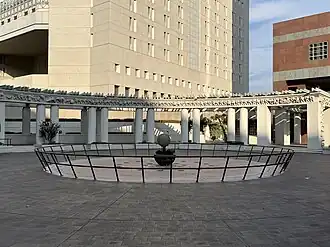 The work is installed in a central plaza in three parts. One fountain has a reclining bronze child and a bronze globe. A niche in a pillar has an abstract metal female figure on a chair. Her ankle is chained to the wall. An overhead cast concrete frieze runs along a pergola and down its columns. The frieze has abstract human figures carrying balls, boxes, and pillars.[3] A human figure in the center of the frieze has multiple arms and holds a knife in one hand and a decapitated human head in another. A nearby human figure clings to the underside of a rhinoceros, and another depicts a human figure with an elephant.[3]