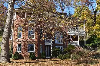 The older rear wing of The Oaks connects to the front section in all three levels. In the basement of the wing is a large fireplace opening, which indicates that this room was probably the original kitchen. The second level of the wing now contains a small kitchen behind an additional dining room. In this room is a very simple mantelpiece which consists of pilasters supporting an undecorated frieze and mantel shelf. The original staircase of the wing remains in a hall between this dining room and the newer front addition. The third level of the wing contains an additional bedroom and bath. The flooring of the back wing is random-width pine, and all of the woodwork and molding is much simpler than that in the 1888 front section of The Oaks.[2][3]