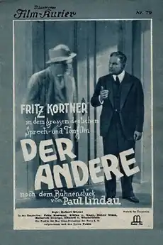 The Other (German: Der Andere) is a 1930 German drama film directed by Robert Wiene and starring Fritz Kortner, Käthe von Nagy and Heinrich George. It was based on the 1893 play Der Andere by Paul Lindau but it is very likely that Wiene was influenced by its first screen adaptation, released in 1913.[1] It was shot at the Terra Studios in Berlin.[2] A French-language version titled The Prosecutor Hallers was shot by Wiene immediately afterwards in the same Berlin studio, but with different actors.