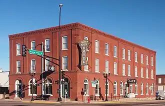 The Palmer House is a three-story brick building on the northwest corner of Sauk Centre's principal intersection. Round-arched windows and doors line the ground floor of the two street-facing elevations, accentuated by decorative brickwork. The arched windows that open into the lobby and restaurant contain stained glass imported from Vienna. The windows of the upper floor are rectangular. Light corbeling marks a belt course just below the second-floor windowsills and along the cornice. Bays of the upper floors are defined by brick pilasters.[2]