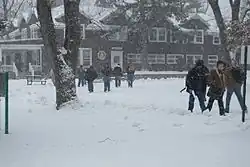 Hamlin Hall, the school's oldest building, in snow