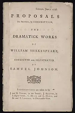 On 1 June 1756, Johnson reprinted his Miscellaneous Observations but attached his Proposal or Proposals for Printing, by Subscription, the Dramatick Works of William Shakespeare, Corrected and Illustrated. On 2 June 1756, he signed a contract to edit an eight-volume set of Shakespeare's writings including a preface, and on 8 June 1756 Johnson printed his Proposal, now called Proposals for an Edition of Shakespeare.[17] The Proposal sold subscriptions for Johnson's future edition at the cost of two guineas, the first paid before and the second upon printing.[18] When Johnson achieved scholarly renown for his A Dictionary of the English Language, Warburton's publishers, Tonson et al., granted him permission to work on Shakespeare.[17]