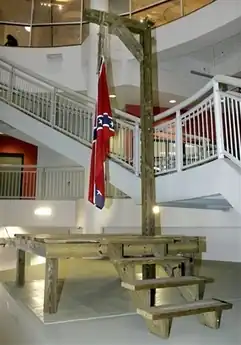 The Proper Way to Hang a Confederate Flag is an art installation by John Sims. The controversial installation consists of a Confederate battle flag hanging from a noose at a 13-foot (4.0 m) gallows. The Proper way to Hang a Confederate Flag was first shown in Schmucker Gallery at Gettysburg College in 2004 as a part of Sims' Recoloration Proclamation: The Gettysburg Redress. Recoloration Proclamation targets specific traditional symbols of southern heritage, which are inextricably linked to slavery and racism in America. Included in the exhibition are recolored Confederate flags, a Confederate flag hanging from the gallows, a contemporary rewrite of the Gettysburg Address, contemporary recordings of the song "Dixie", and a documentary film. A notable piece featured in the exhibition Recoloration Proclamation: The Gettysburg Redress is ReVote, an installation featuring three voting booths used in Florida's disputed 2000 presidential election with re-colored Confederate flags hanging above, including black, red, and green for the Pan-African Flag of the African Liberation Movement. Pink and lavender Confederate flags with feathers and sequins were also created for the exhibition signifying "drag flags". John Sims received national media attention for his lynching of the Confederate flag.