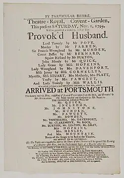 The play was a huge success and enjoyed a lengthy run at the theatre, boosting the finances of the struggling Drury Lane. It appeared to be the hit of the season, only to be eclipsed by the even more dramatic success of John Gay's The Beggar's Opera which opened three weeks later at the rival Lincoln's Inn Fields Theatre.[4] The Provoked Husband was revived frequently over the following century, become a staple part of the repertory in many theatres.