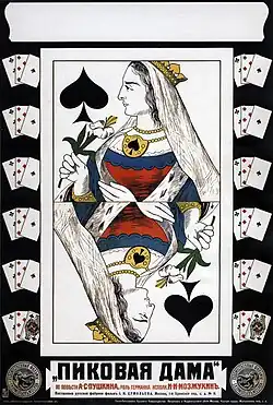 The Queen of Spades (Russian: «Пиковая дама», romanizedPikovaya dama) is a 1916 film adaptation of the 1834 Aleksandr Pushkin short story of the same name. It is noted for its high production values, directorial technique and psychological depth of acting, especially by Ivan Mosjoukine. It is considered to be one of the best pre-revolutionary Russian films.