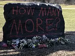 Shortly after a mass shooting on February 13, 2023 that killed 3 MSU students and wounded 5, the Rock was painted black with the text "How many more?" and "Stay Safe MSU."[14] On February 15, the message had been painted over to show a message apparently supporting gun rights. The gun-rights message was replaced the same day with a memorial to the three deceased victims.[15] The same day, the university commissioned Madison Heights-based muralist Anthony Lee to create a more permanent memorial. Lee's artwork included the Spartan logo and the message "Always a Spartan. Brian. Arielle. Alexandria." The artwork by Lee was the centerpiece of a long-running memorial at the site, which remained on the Rock until July 2023, the longest-running message to date.[16][17]