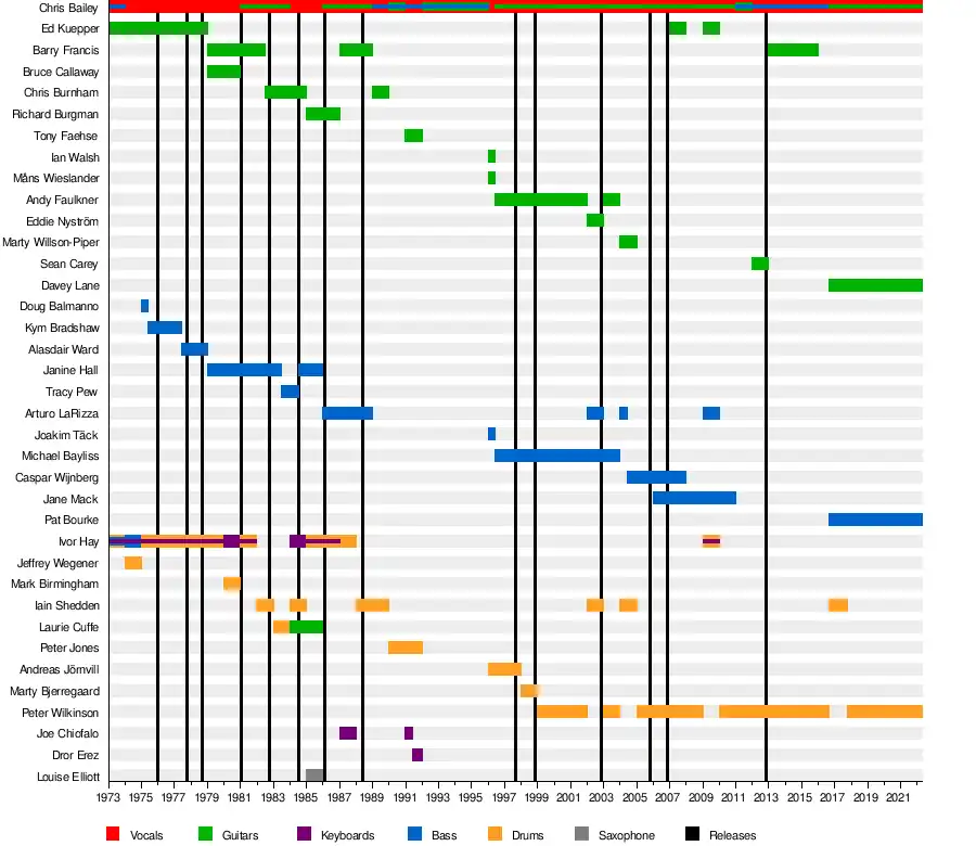 • Chris Bailey – lead vocals (1973–2022; his death), guitar (1980–1983, 1984–1986, 1989–1990, 1991–1996, 1996–2012, 2016–2022), bass (1973–1974, 1989–1996, 2010–2016)