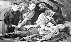 One of the most popular of Barrymore's films, this version extends the story beyond the final battle of man versus whale in a variation on Melville's book. Adding publicity to the film was a bit of early Hollywood hype, unintentional though it may seem: the actress Priscilla Bonner was fired by Barrymore from the role of Wiscasset, in preference for his lover, actress Dolores Costello, and Bonner successfully sued the studio and won a considerable out-of-court settlement.[5] Barrymore exploited the romantic scenes with Costello to their full potential in the film, displaying a "boyish enthusiasm" according to biographer Margot Peters, which made him fall out with Costello's mother. Barrymore drank heavily during the production of the film, and his eyes were constantly bloodshot, with stubble on his chin. Producer Jack L. Warner said "that's a great makeup job" to director Millard Webb, who retorted, "That's not makeup. It's a hangover".[6] The ship used in the film, The Narwhal, was actually a former fighting ship with decks stained with blood from fights.[7] The theme in the orchestral score is "Love's Old Sweet Song".[8]