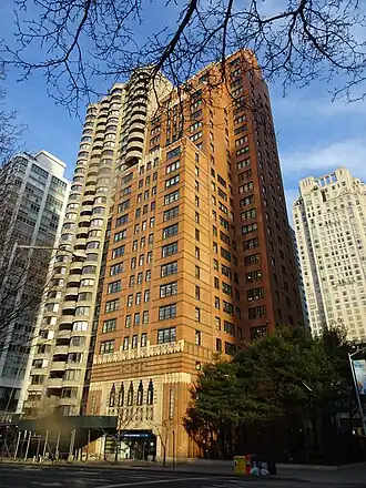 The 61st Street side also contained a wide exit ramp from the garage.[4][11] There are also one- and two-story terracotta frames on 61st Street, which originally led to the offices[19] but later led to the residences.[12] From 1943 until the early 1980s, the south elevation also had a one-story annex.[20]