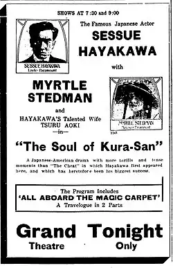 The Soul of Kura San is a 1916 American drama silent film directed by Edward LeSaint and written by Charles Sarver. The film stars Sessue Hayakawa, Myrtle Stedman, Tsuru Aoki, George Webb, Kisaburo Kurihara and George Kuwa. The film was released on October 30, 1916, by Paramount Pictures.[1][2]
