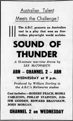 The Sound of Thunder is a 1957 Australian television play by Australian writer Iain MacCormick. It starred Moira Carleton.[2] It was described as "the longest and most ambitious play ABN [the ABC] has put over so far"[1] although The Importance of Being Ernest, which followed on 18 December, exceeded it by 12 minutes.