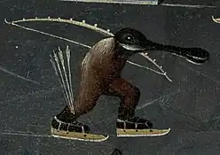 Alongside St. Anthony's positioning and crock, the creatures are the primary connection between the Kansas City piece and other works by Bosch. The fox-headed creature is one example of this. In the Kansas City Temptation of St. Anthony, the fox-headed creature is featured as one of the demons causing mischief for the saint.[4] The fox-headed creature is also apparent on the right panel of the Lisbon Temptation of St. Anthony triptych.[1] The similarity between these figures is seen through their shared hoods and white spots.[1] Another example of Bosch repeating creatures is the spoon-billed creature. The spoon-billed creature is also a feature in The Garden of Earthly Delights, it is noticeable on the right panel in the Hell scene.[1]