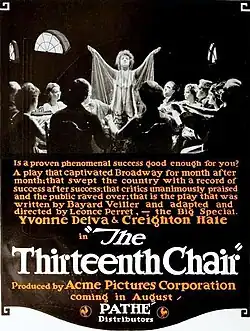 The Thirteenth Chair is a lost[1] 1919 American silent mystery film directed by Léonce Perret and starring Yvonne Delva, Creighton Hale and Marie Shotwell.[2] It was based on a play of the same name by Bayard Veiller. Subsequent film adaptations were made in 1929 as The Thirteenth Chair and 1937 again under the same title.