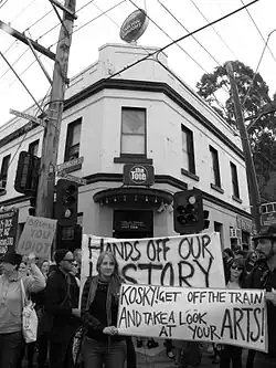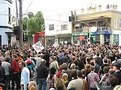On 17 January, an estimated crowd of between 2,000[15] and 5,000 rallied outside the Tote, filling the intersection of Johnston and Wellington Streets and spilling down each street.[16] People found other vantage points on rooftops, upper story windows and balconies in the surrounding buildings. Amongst the crowd were amateur and professional photographers, film makers, a Tote documentary crew, various local independent music celebrities and a large collection of Melbourne's local independent musicians, patrons, long-time Tote patrons, former employees and others.