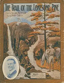 "The Trail of the Lonesome Pine" is a popular song published in 1913, with lyrics by Ballard MacDonald and music by Harry Carroll. It was inspired by John Fox Jr.'s 1908 novel of the same title, but whereas the novel was set in the Cumberland Mountains of Kentucky, the song refers to the Blue Ridge Mountains of Virginia. In it, the singer expresses his love for his girl, June, who is waiting for him under the titular pine tree. It was performed by Laurel and Hardy in the 1937 film Way Out West and this version became a UK Singles Chart hit in 1975, some years after both actors had died.