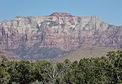 The West Temple is a prominent 7,810-foot (2,380 m) mountain summit composed of Navajo Sandstone in Zion National Park in Washington County of Utah, United States. The West Temple, the highest feature in Zion Canyon, was originally called "Temp-o-i-tin-car-ur", meaning "Mountain Without a Trail" by the Paiute people.[4] It was called "Steamboat Mountain" by local Mormon settlers before 1934, when the USGS officially changed it to its present name, which was applied by John Wesley Powell during his explorations in 1872.[5] West Temple is situated two miles northwest of Springdale, Utah, one mile northeast of Mount Kinesava, and two miles west of the park headquarters. It is one of the notable landmarks in the park. The nearest higher peak is Windy Peak, 10.46 miles (16.83 km) to the north.[1] Precipitation runoff from the mountain drains into tributaries of the Virgin River.