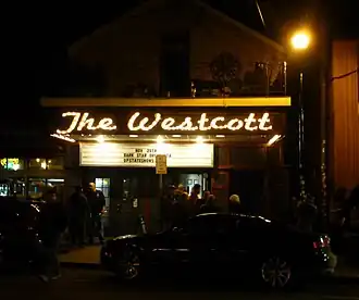 The building that is now known as the Westcott Theater was first constructed in 1919.[2] Formerly called the Harvard Theater and then the Studio, the theater originally acted as a cinema hosting a variety of films ranging from vaudeville films to more risque adult films.[3] In 1993 Nat Tobin, local film enthusiast and manager of the Manlius Art Cinema, took control of the cinema's lease and re-opened the property now calling it the Westcott Cinema.[3] Under Tobin the single-screen cinema screened contemporary films for 14 years before having to close down in October 2007.[3] Interested in appropriating the now defunct cinema, local entrepreneurs Sam Levey and Dan Mastronardi approached building owner Ray Duplain with an offer.[3] After renovating the former cinema, tearing out the old seats and screen and installing a small bar, the Westcott Theater opened for business.[3] The venue began hosting shows in September 2008, although its official opening was not held until November of the same year.[2] The Post Standard's Chris Baker said in 2013 that “the [Westcott] theater has become the most consistent midsize venue in [Syracuse] with about 120 shows annually.”[3]