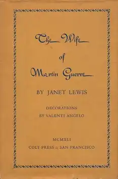 The Wife of Martin Guerre (first published 1941) is a short novel by American writer Janet Lewis based on the story of Martin Guerre, the 16th-century French peasant who apparently returned home to his wife after a long absence but was later revealed to be an impostor. The novel has its origins in research Lewis made into trials based on circumstantial evidence, after reading in-depth about famous trials turning on circumstantial evidence, which prompted her to write a pamphlet describing the risks of using it.[1]