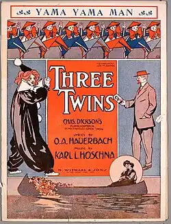 The July 25, 1908, edition of Billboard magazine reported the following story how the Yama song originated. When The Three Twins was rehearsing in Chicago, prior to first opening, Karl Hoschna, the composer, was asked to furnish a "pajama man song". He wrote one called The Pajama Man only to learn that it could not be used owing to another pajama number booked at the Whitney Opera House the next day. Gus Sohlke, the stage director, happened to pass a toy store and saw in the window a doll built out of triangles. Realizing that this had never been used in stage work he decided to have a triangular man chorus in place of The Pajama Man. That afternoon as he, Collin Davis and Hoschna sat together wondering what they would call the song, Sohlke kept repeating Pajama jama yama yama. Suddenly he brightened up and cried "Did either of you fellows ever hear of a Yama Yama Man?" Of course neither one had and Sohlke confirmed "Neither have I! Lets call the new song Yama Yama Man". Quickly Davis set to work to write a lyric around the title and that night Sohlke and Hoschna locked themselves in a room with Bessie McCoy and rehearsed the Yama song and dance for five hours.[6]
