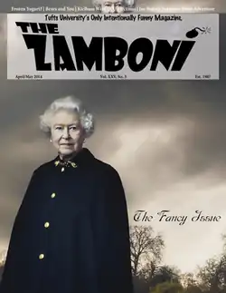 The Zamboni is a student-run humor publication at Tufts University. It was founded in 1989 and releases issues twice a semester. It contains satirical articles (such as fake news briefs, interviews, and op-ed pieces), cartoons, and photos. Their slogan is "Tufts University's Only Intentionally Funny Magazine" and motto is "Cowering Behind the First Amendment Since 1989." The Zamboni is fully funded by the Student Activities Fee as allocated by the Tufts Senate.