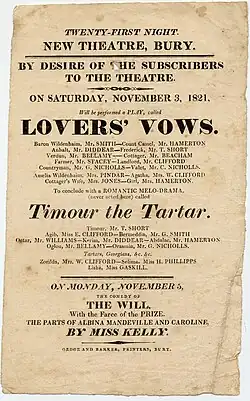 Wilkins was an architect of national repute, responsible for, amongst other buildings, the National Gallery in London and Downing College, Cambridge. As the proprietor of the Norwich Theatre Circuit, he employed a small company of players to undertake an annual tour of six theatres: Yarmouth, Ipswich, Cambridge, Bury St Edmunds, Colchester and King's Lynn. Each was open for just one or two short seasons during the year. The Bury theatre opened for the Great Fair in early October to mid-November and was only available for special events at other times of the year. At that time, it would certainly have enjoyed large audiences particularly as the local community would not have been able to travel far for entertainment, until the arrival of the railway in the 1840s.