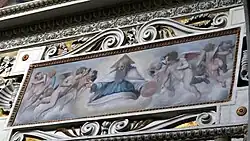 Stucco angels in the corner of the ceiling with the symbols of episcopal authority in the background.