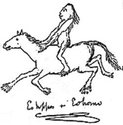 Huxley's sketch of then hypothetical five-toed Eohippus being ridden by "Eohomo"