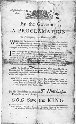 Hutchinson was unsuccessful in his attempts to distance himself from the unpopular Bernard administration, and he continued to be attacked in the assembly and the local press.[47] Despite this, he continued to lobby for a formal appointment as governor. He categorically refused to again serve as lieutenant governor under another governor, preferring instead a posting elsewhere, or to resign the lieutenant governorship.[48]