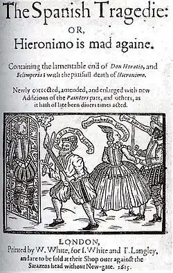 The Spanish Tragedy was probably written in the mid to late 1580s, with its first recorded performance on 23 February 1592 by Lord Strange's Men.[2] The earliest surviving edition was printed in 1592, the full title being The Spanish Tragedie, Containing the lamentable end of Don Horatio, and Bel-imperia: with the pittifull death of olde Hieronimo. However, the play was usually known simply as "Hieronimo" after the protagonist. It was arguably the most popular play of the "Age of Shakespeare" and set new standards in effective plot construction and character development. There were "twenty-nine performances between 1592 and 1597" and "eleven editions between 1592 and 1633", which the historian J. R. Mulryne states is "a tally unequaled by any of the plays of Shakespeare".[1] In 1602 a version of the play with "additions" was published. Philip Henslowe's diary records payment to Ben Jonson for additions that year, but it is disputed whether the published additions reflect Jonson's work or if they were actually composed for a 1597 revival of The Spanish Tragedy also mentioned by Henslowe.