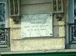 Bugeaud died at 1 Quai Voltaire in Paris (commemorative plate).