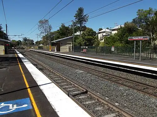 Thomas Street railway station is located on the Main line in Queensland, Australia. It serves the Ipswich suburb of Sadliers Crossing.