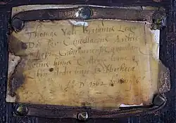 Thomas Yale graduated B.A. at Cambridge University in 1542–3, and was elected a Fellow, member of the governing body of Queen's College of the University of Cambridge about 1544.[26] He commenced M.A. in 1546, and filled the office of Bursar to his college from 1549 to 1551. He was one of the Proctors of the university for the year commencing Michaelmas 1552, but resigned before the expiration of his term of office. In 1554 he was appointed Commissary of the Diocese of Ely under Chancellor John Fuller, and in 1555 he was Keeper of the Spiritualities of the Diocese of Bangor during the vacancy after the death of Arthur Bulkeley, Bishop of Bangor. In that year he subscribed the Roman Catholic articles imposed upon all graduates of the university.