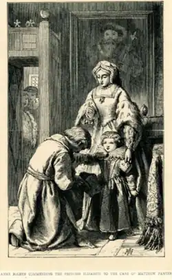 For the Archbishop's consecration, it was Yale who read the Queen's mandate and Oath of Supremacy, and then after prayer, the singing of the Litany, and some questions, and further prayers, with the four Bishops laying their hands upon Parker.[30][32] His consecrators were the Bishops Miles Coverdale, William Barlow, John Scory, and John Hodgkins. Parker, a great friend of Lord William Cecil and Sir Nicholas Bacon, was previously the chaplain of Elizabeth during her childhood and her mother, Queen Anne Boleyn.[33][34] When Anne was arrested, he promised her that he would take care of the spiritual well-being of her daughter, as she was going to be executed for treason.[35] He later became the chaplain of Elizabeth's father, King Henry VIII, and a close associate of Edward Seymour, 1st Duke of Somerset and John Dudley, 1st Duke of Northumberland.[36][37] Archbishop Parker would become the chief architect of Anglican thought, bringing the Church of England into a national institution.[34]
