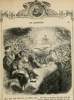 According to Aquinas, the Last Judgment is ultimately a judgment of merits, after which the reward of eternal happiness follows from two causes: "[o]ne on God’s part, i.e., God’s blessing, another on our part, i.e., the merit which is from free will. For men should not be idle, but should cooperate with God’s grace".[25] The consideration of human actions in the Judgment presupposes their achievement through grace, what makes God to recognize the latter's operation in a soul rather than only taking the human will into account. The Judgment functions as a "bridge" between merit and its rewards, and therefore the reward is in fact given freely despite merits are evaluated.[26] In the Summa, Thomas follows Saint Augustine of Hippo in affirming that "He who made you without you, will not save you without you".[27]