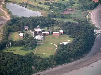 The island's highest point is a drumlin that reaches a height of 78 feet (24 m) above sea level. The rest of the island comprises low rolling hills and a salt marsh. The island has a mixed vegetation, including hardwood tree stands, remnant pear and apple orchards, ornamental trees and shrubs, and salt marsh grasses. The island has open meadows, forests, marine wetlands, sumac groves, and a variety of other geological features as well. Amenities include a formal school campus complete with classrooms, dormitories, dining hall, auditoriums, gymnasium, lab space, outdoor challenge courses, and climbing towers.[1] At low tide, a sandbar connects it to the Squantum peninsula, allowing land travel between the two.