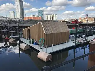 Originally leased from the London Development Agency by Three Mills Studios, the moorings and surrounding land were purchased in 2011 by Vastint, the developer regenerating Sugar House Island, the 26-acre site next to the moorings. Vastint went on to upgrade facilities, creating a floating laundry, and a floating coal shed and bike store, designed by ARC-ML.[6]