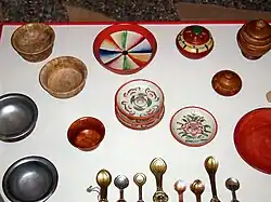Tibetan dinnerware is traditionally made from wood, but sometimes lacquered clay is used. According to local tradition, this handicraft was passed down for generations. Those who could afford to do so purchased high-quality porcelain bowls from elsewhere. In more modern times, other types of porcelain from China or elsewhere are used. Spoons are indispensable for most dishes. Poor people and children wore them around their necks to allow constant and easy access. Knives are sometimes used to eat fruits. Tibetans also use small soup bowls, while the rich used bowls of gold and silver.[5]