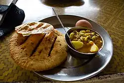 Crops must be able to grow at high altitudes, although a few areas are at low enough altitude to grow crops such as rice, oranges, bananas and lemons.[2] The most important crop is barley. Flour milled from roasted barley, called tsampa, is the staple food of Tibet, as well as sha phaley (meat and cabbage in bread).[3] Balep is Tibetan bread eaten for breakfast and lunch. Various other types of balep bread and fried pies are consumed. Thukpa is a dinner staple consisting of vegetables, meat, and noodles of various shapes in broth. Tibetan cuisine is traditionally served with silverware, in contrast to other Himalayan cuisines, which are eaten by hand. Mustard seeds are cultivated and feature heavily in its cuisine.