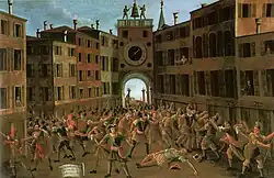Tiepolo, in the meantime, had moved much slower than his father-in-law, as his supporters had stopped to plunder the public treasury,[26] so that combined with Badoer's delay the loyalists were afforded the advantage of dealing with each rebel force in isolation.[56] According to one report, some Milanese merchants appeared before Tiepolo and tried to offer to mediate with the Doge, but Tiepolo, as yet unaware of Querini's death and Badoer's delay, rejected it.[57] Tiepolo and his men had barely reached the Church of Saint Julian in the Merceria when they were informed of what had befallen the Querini column. Tiepolo hesitated, seeking refuge from the rain and holding council under a large elder tree; but in the end he decided to press on regardless, hoping to gain a decisive victory before the arrival of the loyalist reinforcements from Chioggia. Tiepolo thus divided his own men in two so as to attack the square from two sides, one proceeding on the original course along the Merceria and the other coming from the direction of San Basso.[50] The ensuing fight was fierce and bloody, with the rebel troops being pelted with stones from the windows by the local inhabitants, until they began to retreat. At this point took place an event which entered Venetian folklore: close to where the St Mark's Clocktower now stands, a commoner, named Giustina or Lucia Rossi, threw down a heavy stone mortar at Tiepolo. It failed its target but hit the rebels' standard-bearer on the head and killed him. The man fell down and the standard, bearing the inscription 'Liberty', went down with him, disheartening the rebels who began to flee.[49][58][59]