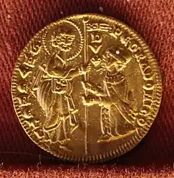 Gradenigo's long tenure as Doge was not tranquil nor very successful in foreign policy.[13] A conflict with Venice's traditional rival, Genoa, ended inconclusively after the Venetians suffered a shattering defeat at the Battle of Curzola in 1298,[13][14] and while a brief conflict with Padua over Venice's salt extraction monopoly was more successful,[13][15] the Doge's 1306 treaty with Charles, Count of Valois to launch a crusade for the conquest of Constantinople from the Byzantine Empire and the re-establishment of the Latin Empire with Charles as emperor went nowhere.[16] Gradenigo also spearheaded, ignoring the other executive councils of the Venetian government, the disastrous attempt to capture Ferrara in 1308–1309, which led to a papal interdict and resulted in severe financial losses and a humiliating retreat for the Republic.[13][17] Venice was simultaneously also embroiled in conflict with the Patriarchate of Aquileia (1309) and faced a revolt in the Dalmatian city of Zara (1310).[13][18]