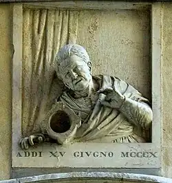 The day of Saint Vitus was declared a public holiday in memory of the "salvation of the Republic",[64] celebrated with a procession led by the Doge to the—now destroyed—Church of Saint Vitus, which was embellished with the pilasters of Tiepolo's palace, as well as new altar vessels.[40] Commoners who had remained loyal or participated in the revolt's suppression were generously and conspicuously rewarded: some of the more prominent commoners were enrolled in the Great Council, while others received minor offices or other advantages and preferments.[40] Giustina or Lucia Rossi's act—likely at least partly legendary—was celebrated as evidence of popular adherence to the Republic's institutions, and she and her descendants were granted the honour of displaying the Gonfalon of Saint Mark yearly on the feast of Saint Vitus, while the rent of her house, which belonged to the Procurators of Saint Mark, ceased to be collected until the Fall of the Republic of Venice in 1797.[71][72] A plaque of Rossi, celebrated in legend as the Vecia del Morter or Vecchia del Mortajo ("crone of the mortar") with the date 15 June 1310 was placed in the Mercerie in 1841, while a piece of white marble in the pavement is traditionally held to be where Tiepolo's standard-bearer died.[71][72] Similarly, the Scuola Grande della Carità, along with the painters' guild, who had helped battle Querini's followers at Campo San Luca, were allowed to hoist their corporations' emblems next to the banner of Saint Mark on that site.[40][73]