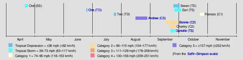 During the year, three tropical depressions, one subtropical storm, two tropical storms, and four hurricanes formed. It produced seven storms, less than the average of ten usually formed throughout an Atlantic hurricane season, while four of the storms went on to become hurricanes. The first cyclone to form inside the official season was Tropical Depression One, which formed on June 25. Of the four hurricanes, Hurricane Andrew was the most intense, reaching category 5 status. In late June, Tropical Depression One caused severe flooding in southwestern Florida and Cuba; heavy rainfall was recorded in Pinar del Río, Matanzas, and Havana.[1] When Andrew struck Florida and Louisiana in August, it became the second-costliest hurricane to hit the United States. Damages were estimated to be about $26.5 billion and 68 people were killed.[2] Tropical Storm Danielle made landfall at the Delmarva Peninsula on the Virginian coast on September 25, causing minimal flooding. There was one recorded death recorded due to Danielle; a ship east of New Jersey was sunk due to rough seas.[3] The season finished on October 30 when Hurricane Frances became an extratropical gale before dissipating.