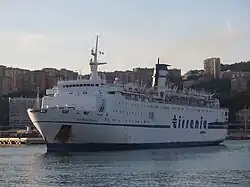 Between 1976 and 1978, pending the gradual entry into service of the units ordered from Italcantieri, the ferries Canguro Bianco and Canguro Verde were chartered from Linee Canguro S.p.A, Espresso Venezia and Espresso Ravenna from Adriatica, all destined to reinforce connections with Sardinia, including the new lines Genoa-Olbia-Arbatax and Genoa-Cagliari.[49][50] The first two ships were returned to the owning company in 1978, while the others continued to be part of the Tirrenia fleet thereafter.[49] During the same period, a renewal of the Sardinian regional fleet was put in place through the purchase of the small ferries Carloforte and Limbara while the ferry La Valletta, deemed unsuitable for connections to Malta, was sold to Siremar and replaced with a German-built unit, the Malta Express.[48]